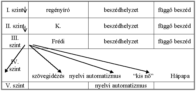 A regényíró idézi K.-t, K. Frédi bácsit, Frédi idéz irodalmi szöveget, nyelvi automatizmust, a "kis nőt" és Hápapát; a "kis nő" is idéz stb. Frédi bácsi monológjának végén az egyenes beszédben nyelvi automatizmus, belső beszéd, önidézés, a gyerekhallgatóság kérdéseinek idézése, ismételt önidézés hangzik fel. A nagy oktatási monológ hallgatása közben és utána K. elbeszélésében elszaporodnak a belső beszédet idéző mechanizmus jelei, amelyek az idézések és fölidézések különböző időkhöz kötött dialogikus szövevényéről tanúskodnak. Pl.: "ő, K., a legkevésbé sem értette...", "nem tudhatja eldönteni...", "ezt már ő, K. is megfigyelte...", "úgy érez- te...", "kiáltott önmagában többször is..." stb. Az idézetek közlésének formái (egyenes beszéd, függő beszéd, szabad függő beszéd) nem válnak lényegessé a regényszövegben. (Természetesen a második szinten beszélhetünk csupán ezekről a beszédformákról, hisz az első szinten a függő beszéd kizárólagos.) Mivel az egész regény egyetlen mondat, a szabad függő beszéd felismerhetetlen. A függő beszéd pedig teljes mértékben egyenértékű az egyenes beszéddel, mert bárkinek bármiféle szinten való idézéséről van is szó, a stilisztikai differenciáltságot, a nyelvi sajátságokat, az expresszív szignálokat a szöveg következetesen igyekszik megőrizni.