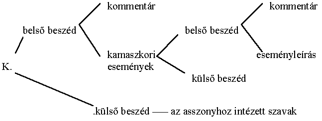 A hangos, külső beszéddel a belső beszéd áll szemben, s ebbe a két fő beszédtípusba épülnek bele az idézések egyéb fajai: mások hangos beszéde (ebben újabb idézetek rejlenek), szövegidézés, nyelvi automatizmusok, önidézés, mások belső beszédének idézése stb. Regényünkben ez az elágazás K.-nak, az elbeszélőnek a belső és külső beszédéből indul ki. Az egész szöveg az asszonyhoz intézett hangos beszéden alapul. Ebbe a mesébe ékelődnek K. belső futamai, kommentárjai. Ezek csomópontokként hálózzák be a regény szövetét, és különösen hangsúlyosak a mű elején és végén. A beszéd jelen idejének síkján külső beszéd minden olyan megjegyzés, amely a hallgatóhoz, az asszonyhoz szól. Pl.: "mit gondol az asszony, véletlen volt-e vagy tudatos fogás, ravaszság Drahosch játéka a szoknyával..." stb.